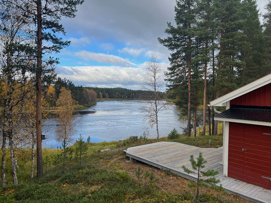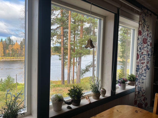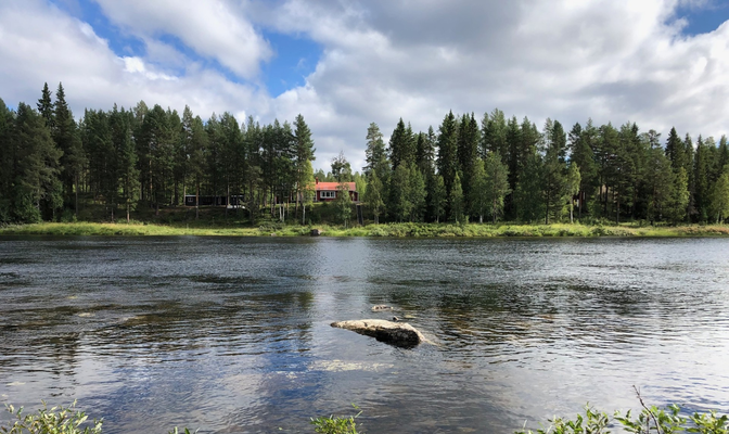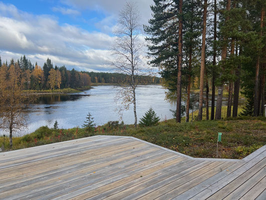 Stugan ligger direkt vid Laisälven med en fin utesitplats
