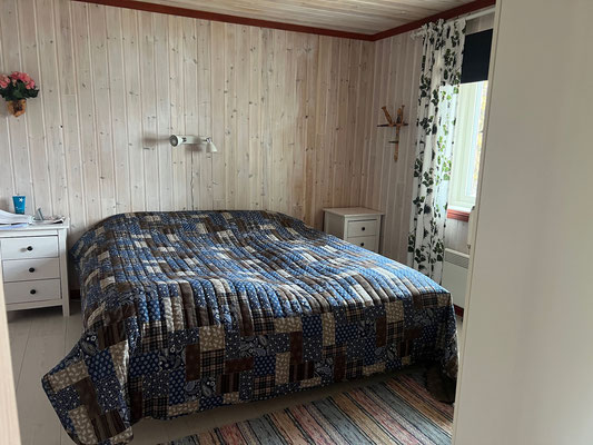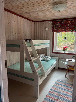 Ett sovrum med en dubbelsäng (två sängar 90 cm bredd) och andra sovrum med en våningssäng med en 120 cm bredd madrass och en 80 cm bredd madrass.